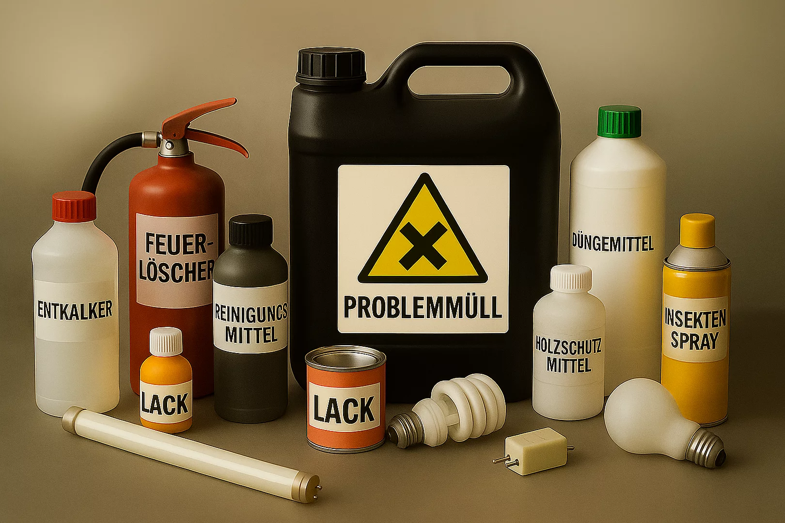 Abbeizmittel, Autopflegemittel, Akkus, Batterien, Autobatterien, Bauschäume, Chemikalien (Photochemikalien, Säuren, Laugen, Frostschutzmittel), Desinfektionsmittel, Düngemittel (zum Beispiel unbrauchbarer Blumendünger), Entkalker, Farbverdünner, Feuerlöscher, Farb- und Lackreste (aber: Dispersionsfarben gehören in den Restmüll), Fleckentferner, Gaskartuschen (zum Beispiel aus Campingkocher), Holzschutzmittel, Insektenspray, Klebstoffe, Kitt- und Spachtelmasse, Solarflüssigkeit, Kondensatoren, Leuchtstoffröhren und Energiesparlampen (Glühbirnen gehören in den Restmüll), Lösungsmittel (z.B. Aceton, Nagellackentferner, Pinselreiniger, Terpentin), Ölfilter, Pflanzenschutzmittel, Quecksilber (Thermometer, Schalter mit Quecksilber), Reinigungs- und Pflegemittel (zum Beispiel Abflussreiniger, Haushaltsreiniger, Möbelpolituren, Imprägniermittel), Rostschmutzmittel.