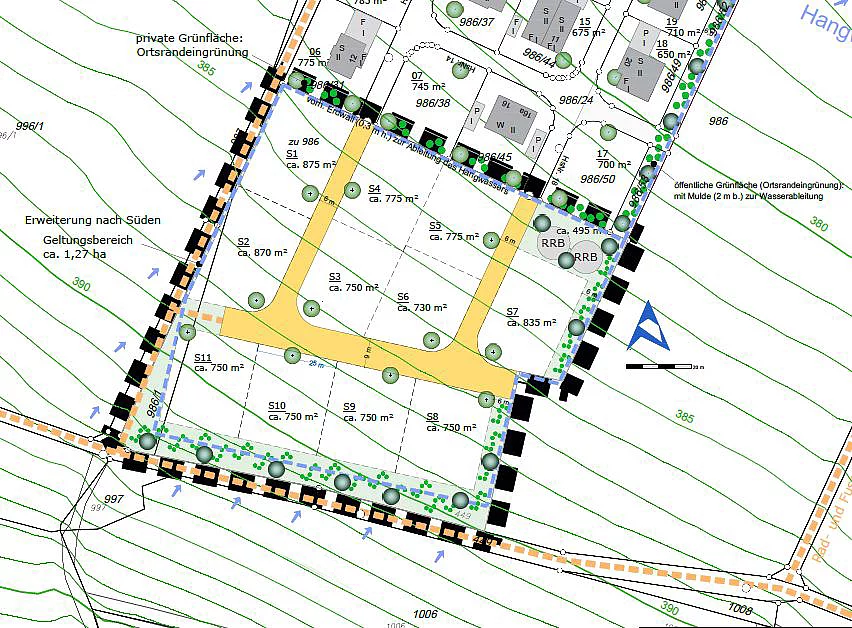 „Wiesenweg III“ umfasst einen Geltungsbereich von rund 1,27 Hektar und sieht insgesamt elf Bauparzellen vor. Die Grundstücksgrößen liegen zwischen ca. 750 und 875 m² und orientieren sich damit an den bisherigen Bauabschnitten. Die verkehrliche Erschließung soll über den Wiesenweg sowie den Kornweg erfolgen. Der Anschluss des Abwassers ist an die bestehenden Kanalleitungen beabsichtigt. Mit Umsetzung dieses dritten Abschnitts wird das gesamte Wohngebiet „Wiesenweg“ aus insgesamt 49 Grundstücken bestehen. Aufgrund der Hanglage des Gebiets sind im weiteren Planungsverlauf außerdem Mulden zur gezielten Ableitung und Rückhaltung von Oberflächenwasser vorgesehen. Mit der Ausarbeitung der notwendigen Pläne hat der Gemeinderat das Ingenieurbüro Renner + Hartmann Consult GmbH aus Amberg beauftragt. In den kommenden Monaten werden die weiteren Planungsschritte erfolgen, einschließlich der Beteiligung der Öffentlichkeit und der Fachbehörden. Bauwillige tragen sich bitte in den Newsletter (Link unten) ein, um keine Neuigkeiten zu verpassen.