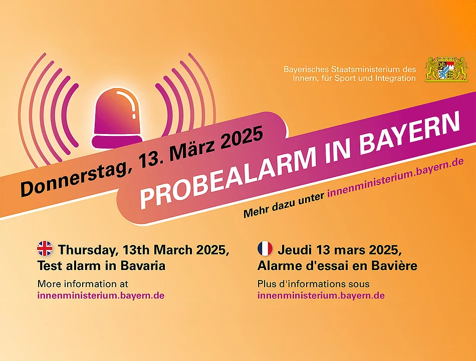 Am 13. März 2025 findet in Bayern wieder der landesweit einheitliche Probealarm statt. Neben den vorhandenen Sirenen der Gemeinden und Kreisverwaltungsbehörden werden auch andere Warnmittel, z. B. Warn-Apps und Cell Broadcast, erprobt.