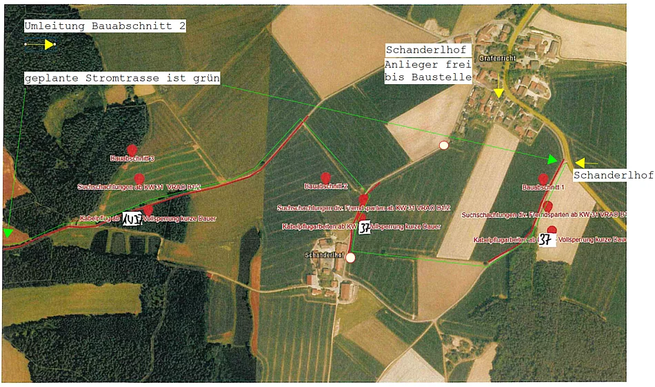 Vom 11.09. bis 13.09.2023 werden der Frotzersrichter Weg, der Schanderlhofweg und der Tiefenweg zwischen Grafenricht und dem Schanderlhof zur Verlegung eines 20 kV-Kabels für den gesamten Verkehr gesperrt. Die Sperrungen der genannten Wege erfolgen nacheinander in einzelnen Bauabschnitten. Für die Vollsperrung des Frotzersrichter Wegs wird eine Umleitungsstrecke zum Schanderlhofweg ausgeschildert.